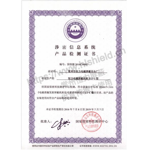 1. 具有國家保密局BMB19-2006《電磁泄露發(fā)射屏蔽機柜技術(shù)要求和測試方法》C級認(rèn)證的檢測證書及檢測報告。